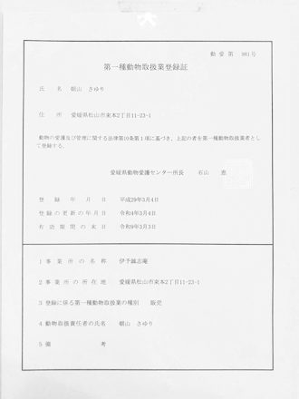 動物取扱業登録による表記 (動物関係法規 第6条1.イにより)